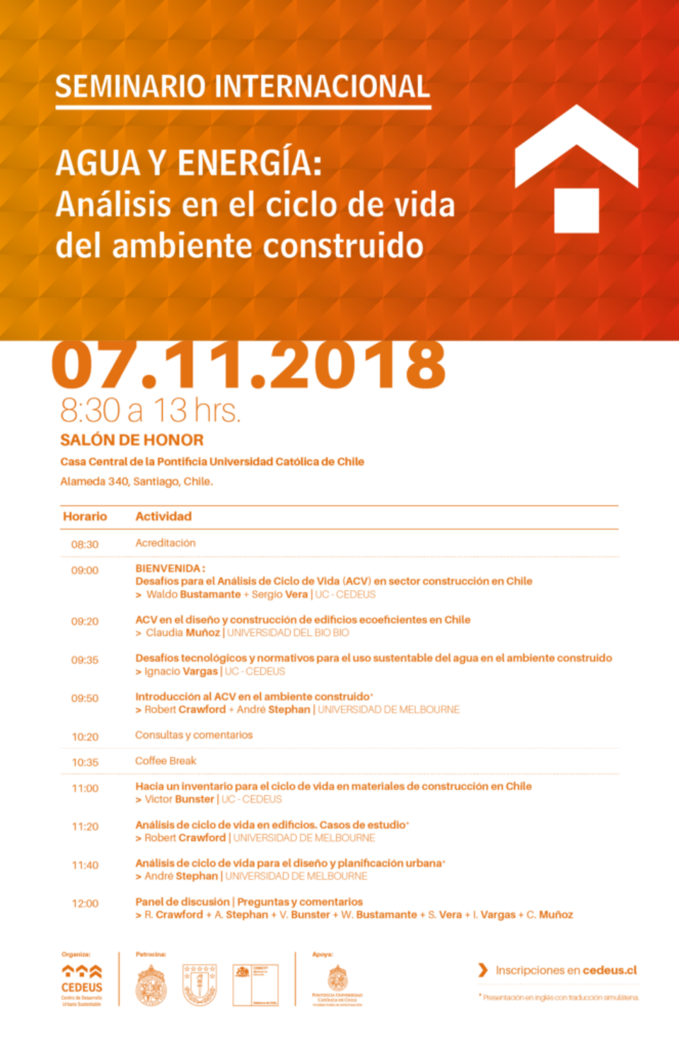 El Centro de Desarrollo Urbano Sustentable, CEDEUS, con el apoyo de la Vicerrectoría de Investigación de la Universidad Católica, realizará el seminario “Agua y energía: Análisis en el ciclo de vida del ambiente construido” este miércoles 07 de noviembre en el Salón de Honor de la Casa Central de la Pontificia Universidad Católica de Chile.