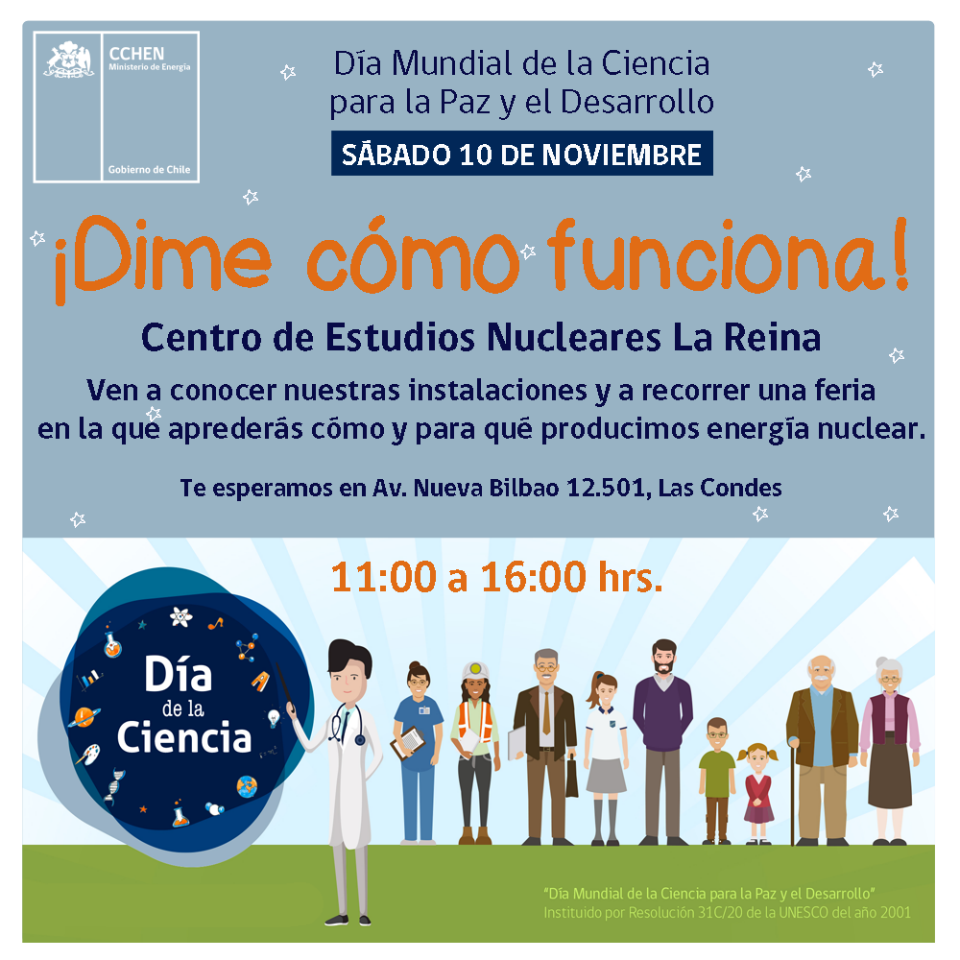 La Comisión Chilena de Energía Nuclear (CCHEN) celebrará el Día de la Ciencia el sábado 10 de noviembre, entre las 11:00 y 16:00 horas, en el Centro de Estudios Nucleares (CEN) La Reina, ubicado en Avenida Nueva Bilbao 12.501, Las Condes.