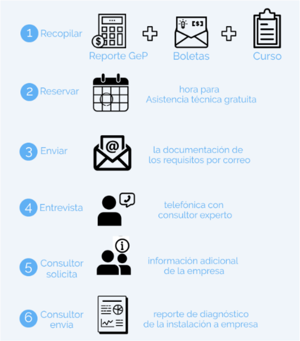 Finalmente, la Agencia elaborará un reporte de diagnóstico, que contendrá la información levantada y analizada, las medidas de eficiencia energética que se pueden implementar en la empresa, sus potenciales resultados, las medidas de mayor impacto, recomendaciones de proveedores, implementadores y de fuentes de financiamiento.