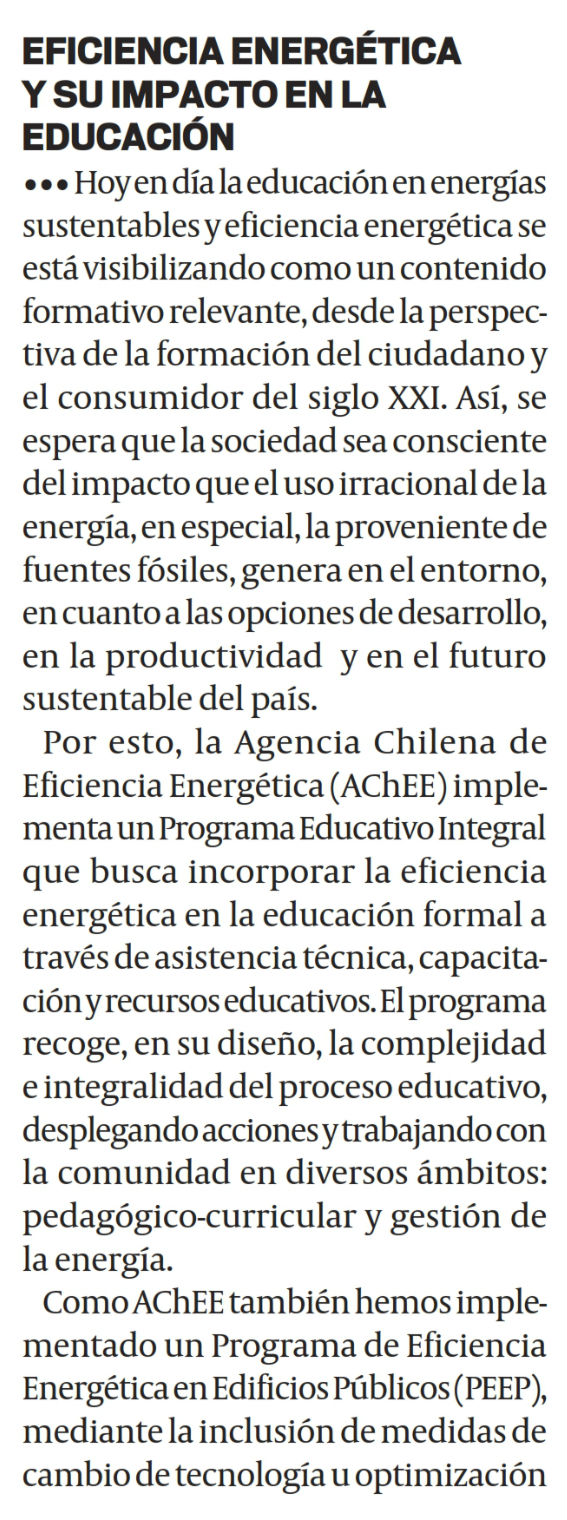 Hoy en día la educación en energías sustentables y eficiencia energética se está visibilizando como un contenido formativo relevante, desde la perspectiva de la formación del ciudadano y el consumidor del siglo XXI. Así, se espera que la sociedad sea consciente del impacto que el uso irracional de la energía, en especial, la proveniente de fuentes fósiles, genera en el entorno, en cuanto a las opciones de desarrollo, en la productividad y en el futuro sustentable del país.