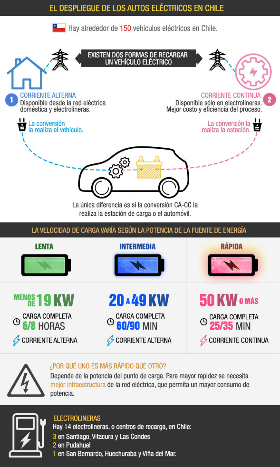 17 julio 2017 El panorama de los autos eléctricos en Chile: Cuántos son y dónde se cargan Existen tres tipos de “electrolineras” en el país, que ofrecen distintas tecnologías y velocidades de carga. Revisa aquí los detalles. Fuente: Emol.com