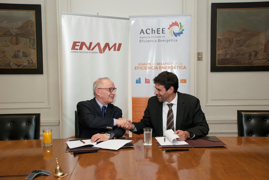 En el marco del desarrollo de la Estrategia de Gestión de la Energía de largo plazo que lleva adelante la Empresa Nacional de Minería (ENAMI), y el rol que cumple la Agencia Chilena de Eficiencia Energética en la promoción de la gestión de la energía de forma sistemática al interior de las empresas; Jaime Pérez de Arce, vicepresidente ejecutivo de ENAMI; y Diego Lizana, director ejecutivo de la Agencia Chilena de Eficiencia Energética, firmaron esta tarde un convenio de cooperación para que ambas organizaciones trabajen en conjunto, en la incorporación de buenas prácticas en el uso eficiente de la energía en instalaciones de la compañía estatal.