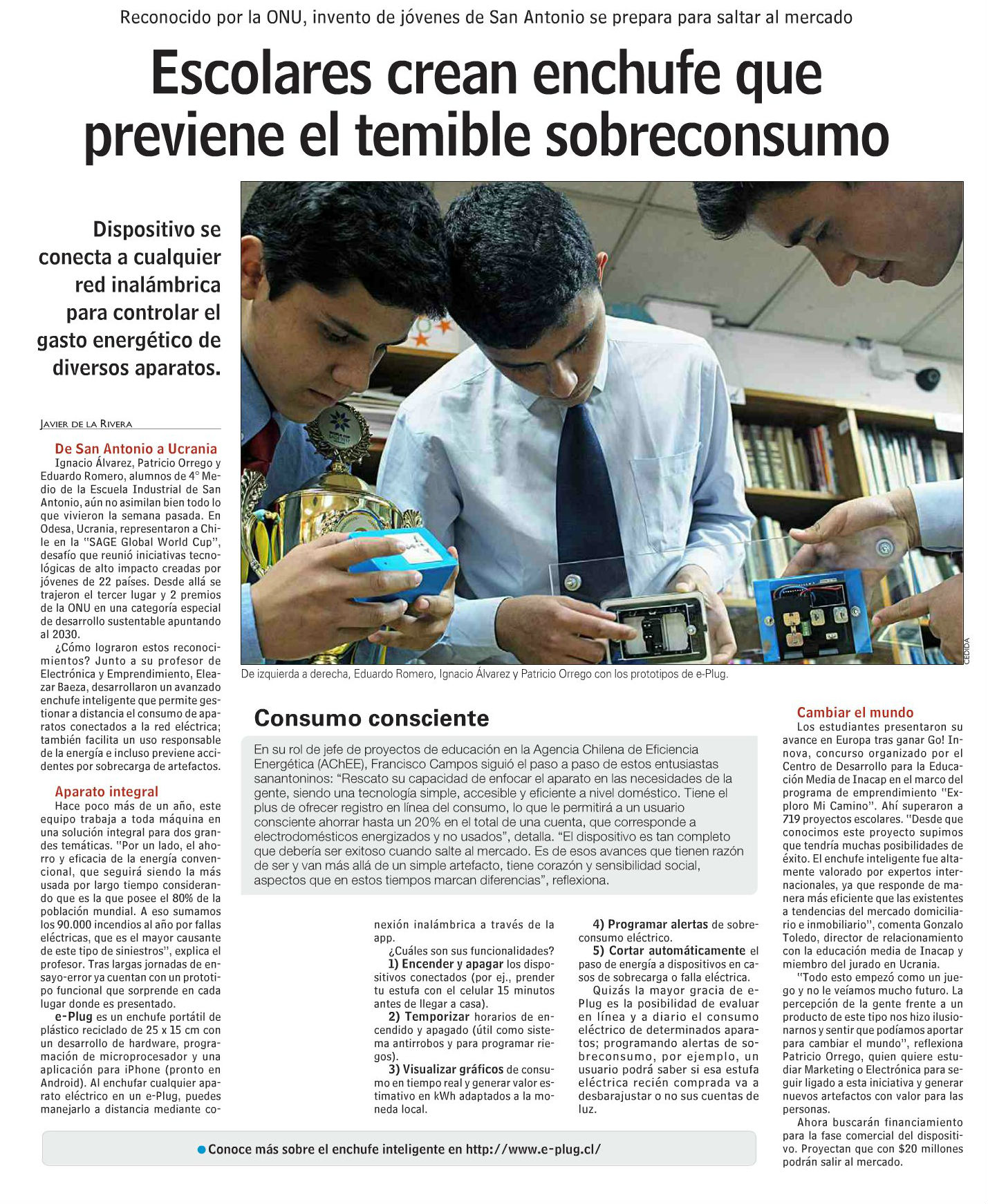 28 agosto 2017 Escolares crean enchufe que previene el temible sobreconsumo Reconocido por la ONU, invento de jóvenes de San Antonio se prepara para saltar al mercado. Dispositivo se conecta a cualquier red inalámbrica para controlar el gasto energético de diversos aparatos. Fuente: Diario Las Últimas Noticias