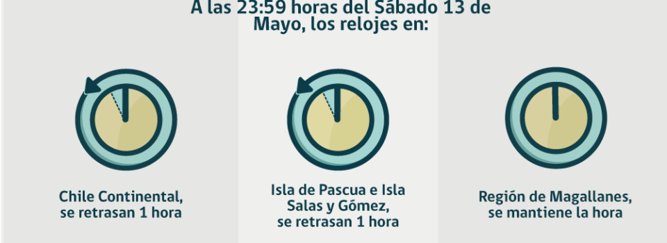 El sábado 13 de mayo a las 23:59 horas comienza el horario de invierno en el territorio continental y en el territorio insular. Desde este año, la región de Magallanes tendrá el horario de verano todo el año.