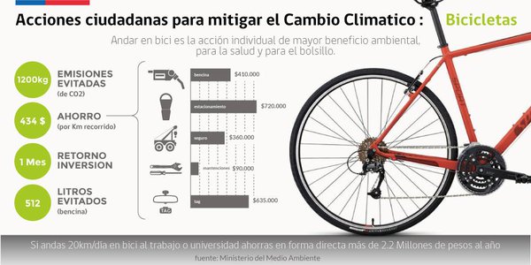 En el Día Mundial de la Bicicleta, el Ministerio de Medio Ambiente destaca a través de las redes sociales que si andas en promedio 20 kilómetros al día, puedes llegar a ahorrar $2,2 millones respecto de los costos asociados al uso de vehículos.