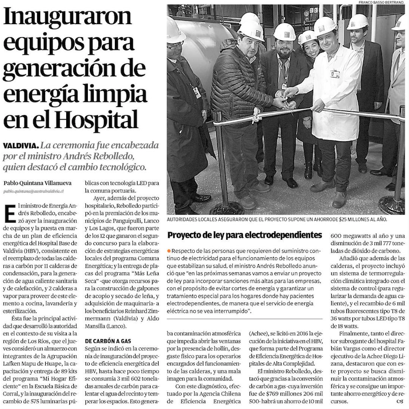 31 julio 2017 Inauguraron nuevas obras de mejoramiento en EE para el Hospital Base de Valdivia, implementadas por la Agencia La ceremonia fue encabezada por el ministro Andrés Rebolledo, quien destacó el cambio tecnológico. Fuente: Diario Austral