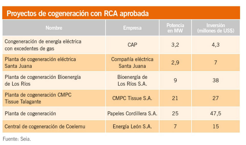 A futuro las perspectivas de seguir incorporando esta tecnología en la matriz energética también es positiva, según muestran los datos del Sistema de Evaluación de Impacto Ambiental (Seia), donde actualmente se registran seis proyectos de cogeneración que cuentan con su Resolución de Calificación Ambiental (RCA) aprobada, los cuales totalizan cerca 66 MW (ver recuadro).