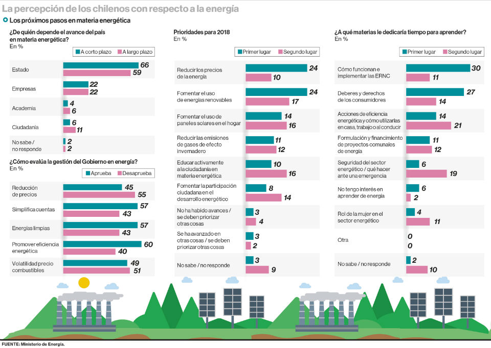 La “Encuesta Nacional de Percepción Pública en Energía 2017”, reveló que este sector es cada vez más importante en la sociedad. La ciudadanía cree que en el corto y el largo plazo, el Estado es fundamental en el desarrollo energético. Además, el informe mostró que a pesar de que la gran mayoría de los chilenos quiere tener paneles fotovoltaicos en sus casas, el valor de éstos aún es un impedimento.
